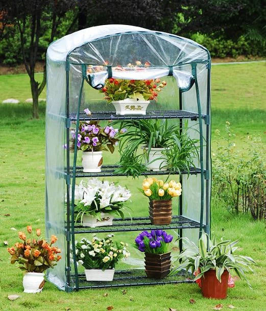 This mini greenhouse can go just about anywhere – patio, balcony, deck, garden, or lawn. It measures 35″W x 19″D x 62″H. The four shelves keep seed trays, pots, and tools on hand as you care for your sprouting plants.