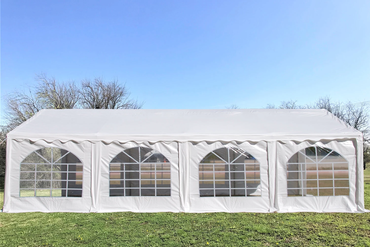 We recommend that you buy storm straps and extra-long ground pegs to further secure your party tent in case of windy weather.