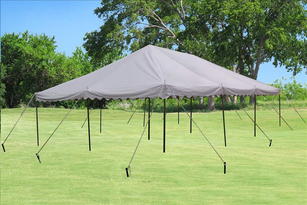 Pole tents provide a traditional look and feel to any event. With quality materials, attention to detail and easy installation, it is great for variety of applications, such as backyard parties, wedding, or events supplied by rental companies. The PVC top is supported by poles located under the center of the top and then tensioned over side and corner poles, which are anchored to the ground using ropes.