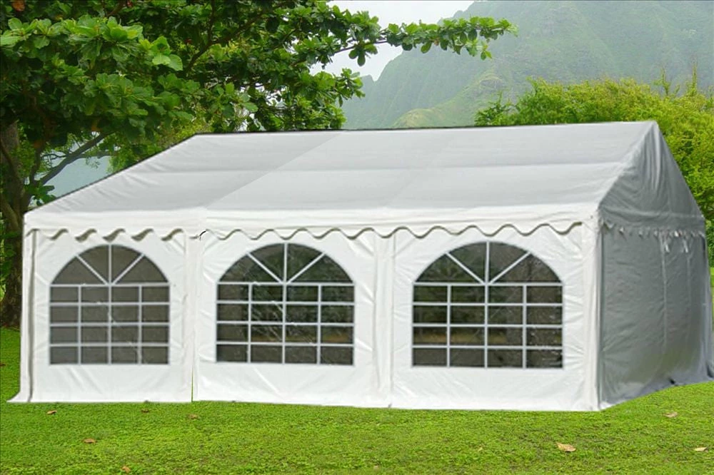 This is our best model – very hard wearing, with a thick heavy duty 450g PVC canopy and 350g PVC sides. The fabric is a much more luxurious material than the polyethylene used . The material is specially coated on the inside making it much more water resistant than the polyethylene. A fantastic durable canopy is ideal for home use and for commercial use. Easy to assemble; great for weddings, parties, shows, exhibitions, storage and car shelter.